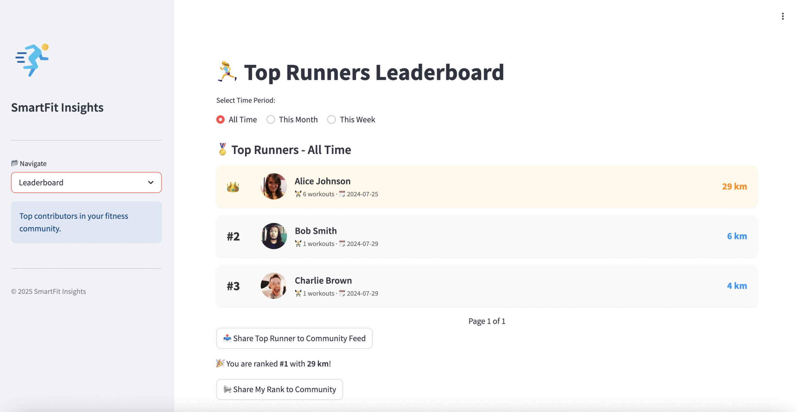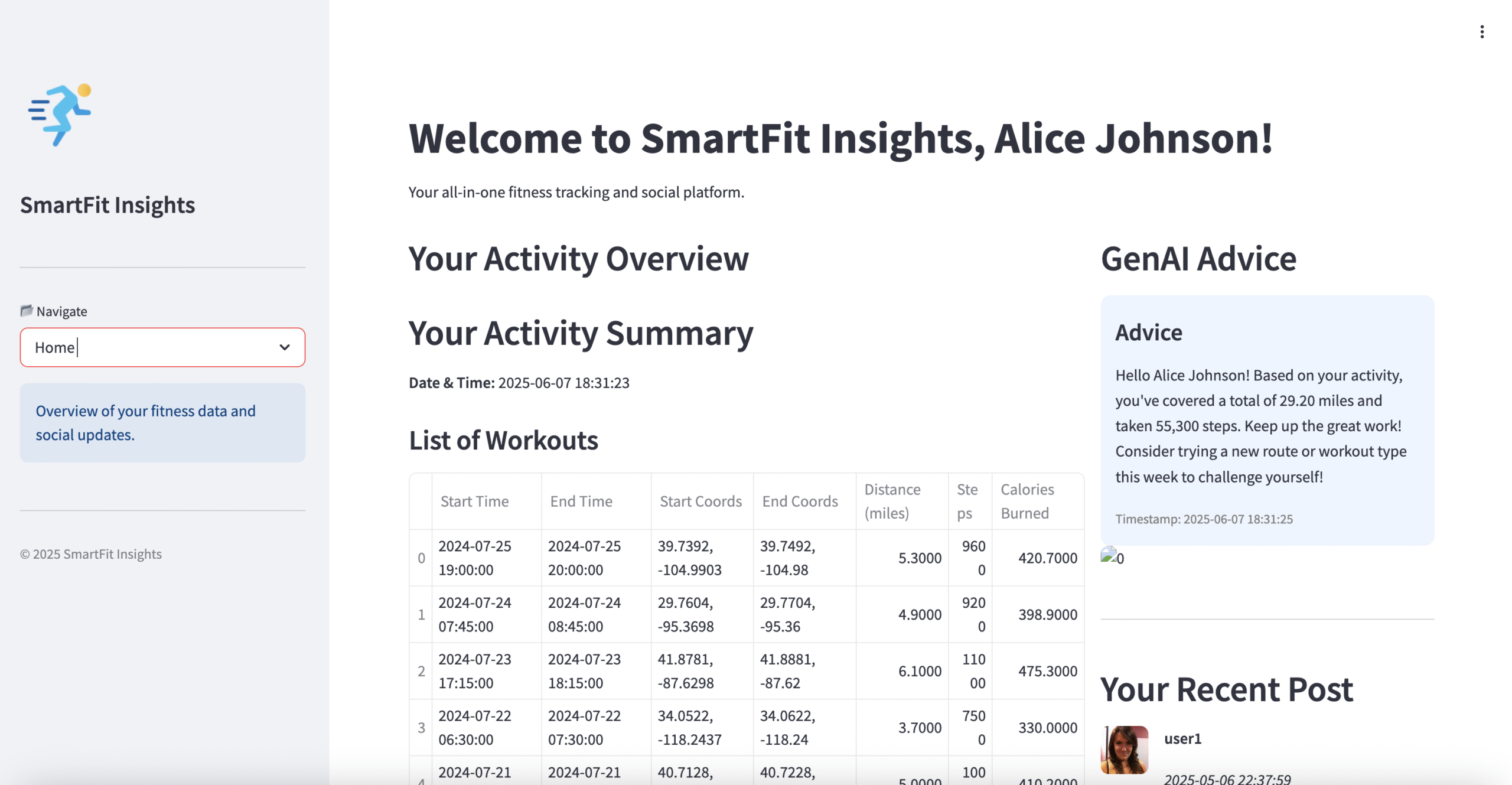 SmartFit Insights is a fitness tracking and social sharing platform where users can log their workouts, receive AI-generated health advice, and interact with their fitness community